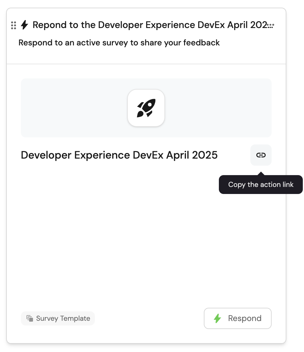 Hover over the action card, then click on the chain icon to copy the link to the survey.